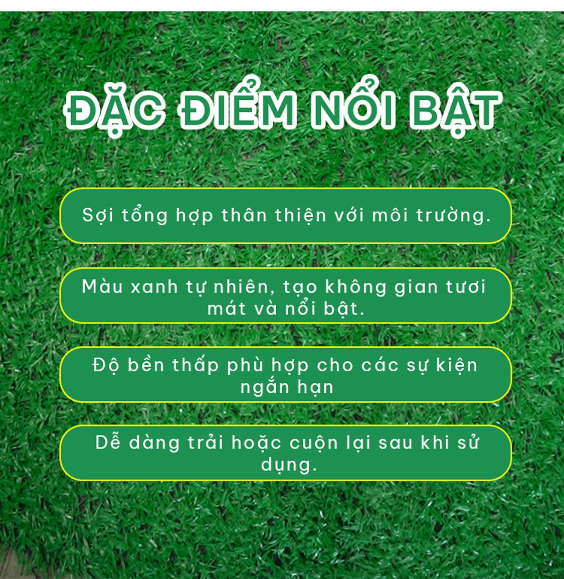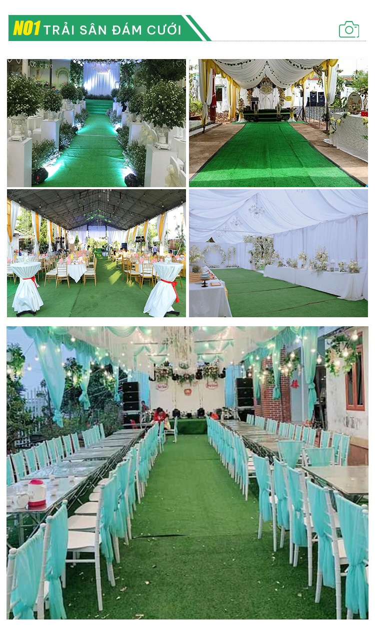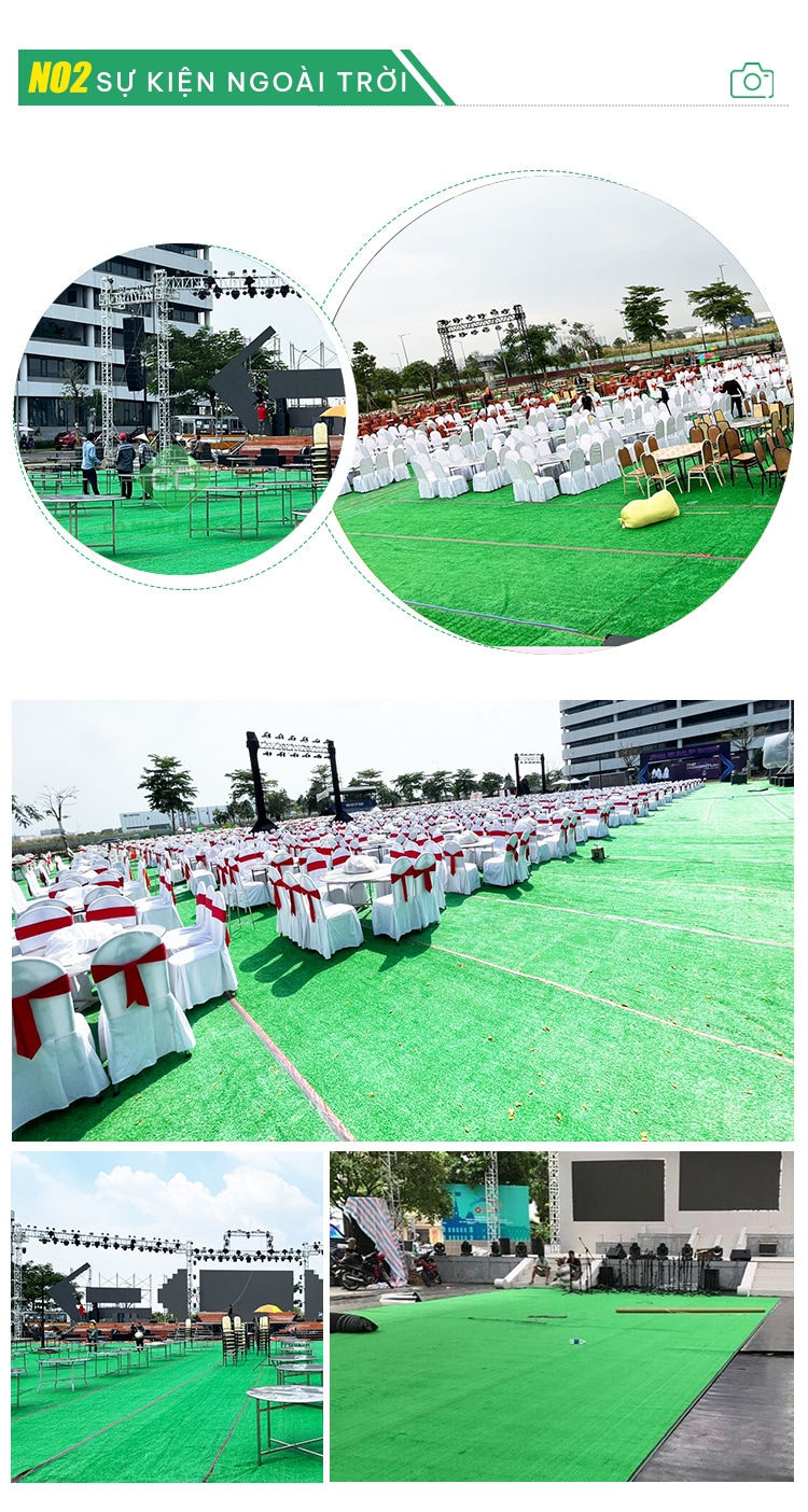 Thảm cỏ nhân tạo sự kiện mang ưu điểm: màu sắc mát mẻ, dễ dàng setup, chi phí rẻ, vệ sinh dễ dàng, đây được cho là sự lựa chọn hoàn hảo đối với các chủ nhà hàng, nhà thầu thi công lắp ráp công trình sự kiện, hoặc chủ rạp đám cưới lựa chọn…